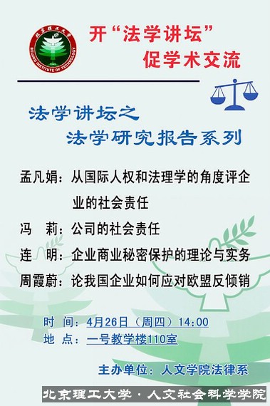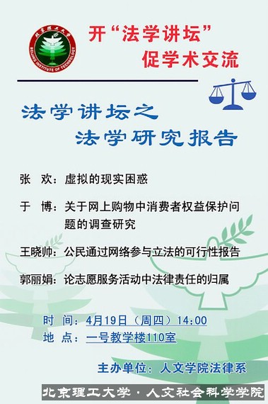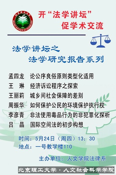 自4月19日始至5月24日,人文学院法学讲坛共分四坛,坛坛飘香呈现在师生面前。在这一系列活动中,上至学院副院长、副书记以及各位教授、导师,下至全体同学,齐心参与、各献其力,开创了人文学院新的学术氛围,为BB贝博综合性大学人文素养的培育作出了力所能及的努力。