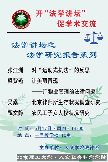 “法学讲坛”是法学理论专业硕士研究生学位课程的组成部分。它以一种全新的课程设计形式为广大研究生同学提供了一个读书、思考、写作的机会,为同学们搭建了一个报告、评论、讨论的平台。