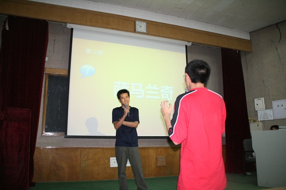 接下来是考察选手对奥运知识的熟悉程度,比赛分成必答题和默契猜猜两个环节。在必答题环节中7名参赛选手都表现出自己对奥运充分的了解。默契猜猜猜环节中,选手与自己的搭档采用一个比划一个猜得形式,比划的同学只能采用肢体语言或英语,猜词过程中体现出选手对于运动、英语以及默契都有深切的体会。