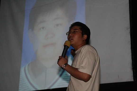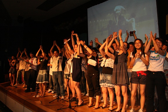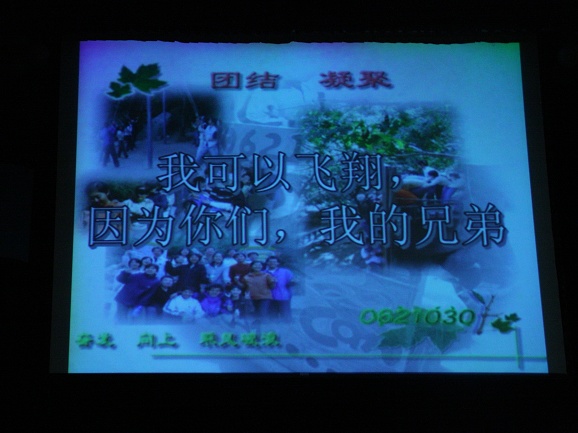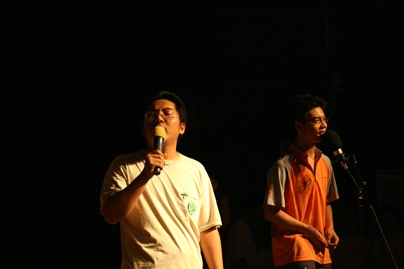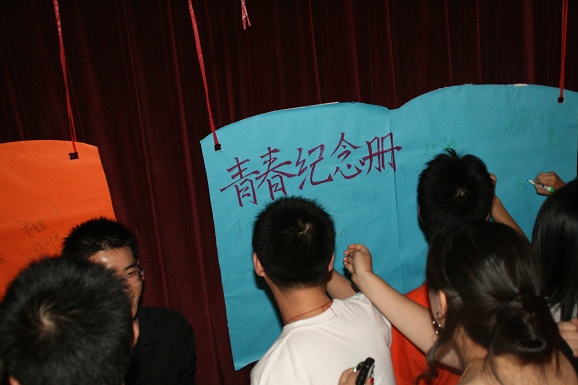 中场休息的时候,03级所有学生上台在青春纪念册上留下了自己个性的签名。同时为了感谢王征辅导员四年以来在生活和学习上无微不至的关心,他们用把辅导员抛向空中的方式来表达自己的感谢之意。之后,王征辅导员把03级所有学生大一刚踏进学校时鲜为人知的照片向大家展现了一遍,以前的幼稚和现在的成熟体现了大家成长过程,以这种特殊的形式怀念过去,展望未来。随后,在大家一致的要求下,王征和胡文辅导员同台倾情演唱了《月亮代表我的心》,用歌声把祝福送给03级的所有毕业生。为了表达自己那份激动的心情,大家还在王征辅导员衣服上签名并合影留念。
