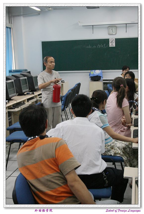检查组在对研究生网络视听实验室进行检查时,向正在上机的同学们介绍了基本的安全知识、遇到紧急情况怎样疏散等。外国语学院何老师还向学生们介绍了灭火器的使用方法。