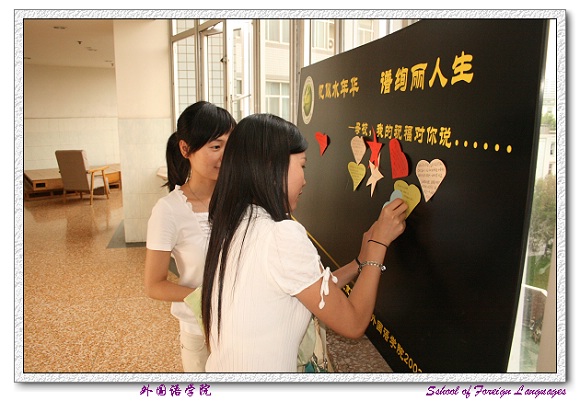 我院制作了喷汇板,为毕业生准备了各种颜色,各种图形的祝福帖,写上毕业生对母校的祝福送给学校。