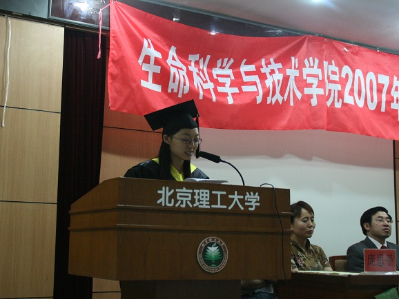 接下来,由本科生代表张倩同学发言,她回忆了在生命学院学习生活中难以忘怀的点点滴滴:对所有生命学院老师们的无私帮助表达了真挚的感激之情,也表达了对于迎接挑战、赢得未来的信心和为BB贝博艾弗森官方网站、为生命科学与技术学院争光的决心。他代表在座的每一位毕业生表示,在今后的岁月 中将不断地学习,提高自己,回报母校、回报生命学院的培养。