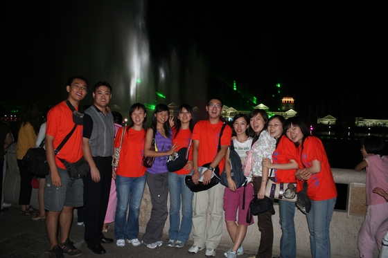 晚上,我们有幸观赏了全亚洲最大的音乐喷泉,60年大庆之际,喷泉每晚开放。整个河道上,霓虹、喷泉交相辉映,随着那歌颂党歌颂国家的奋进激昂的歌曲,喷泉和灯光有节奏地变换,着实为这个旅游城市又添一道亮丽风景。