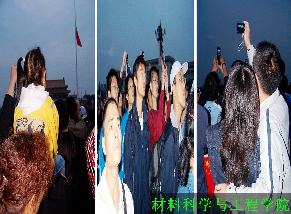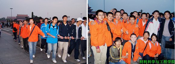 在国庆节即将来临之际,距北京奥运会开幕还有313天之时,在材料学院分党委指导下,分团委书记周芳集、分团委副书记新生辅导员李紫千、班主任杨艳波、翟进贤及学生会干部(“好运北京”奥运测试赛的志愿者为主)带领全院07级本科新生来到天安门广场观看了升国旗仪式。此次活动作为材料学院爱国主义主题教育活动之一,旨在大力弘扬爱国主义精神,激发材料学院师生强烈的民族自豪感和自信心,将爱国情节与志愿北京紧密联系起来,构建和谐。