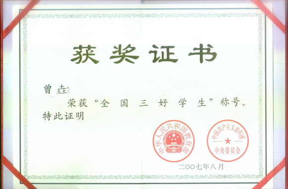 从2007年8 月开始,教育部、共青团中央组织在全国普通高等学校和中等职业学校中开展第九次“全国三好学生”、“全国优秀学生干部”、“全国先进班集体”评比活动。BB贝博信息科学技术学院光电工程系的2003级曾垚同学顺利通过了学校、北京市、教育部三级评审,最终获得了“全国三好学生”荣誉称号。