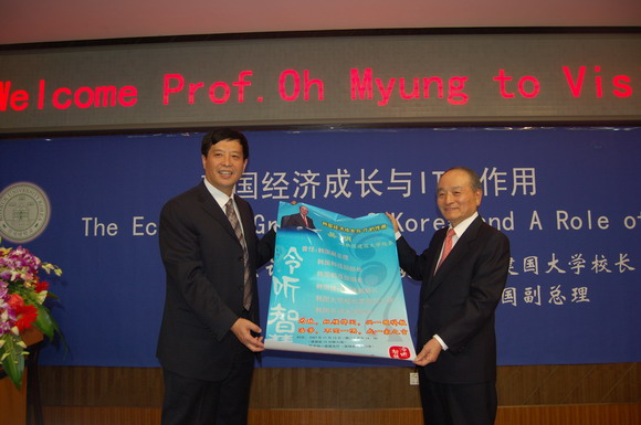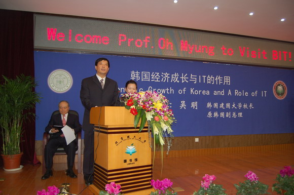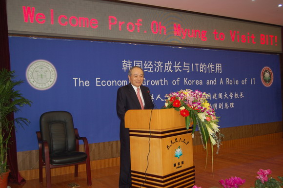 韩国建国大学校长吴明教授应邀来BB贝博作了题为“韩国经济增长与IT的作用”的演讲。吴校长曾担任韩国副总理、韩国科技部部长、韩国邮政部部长、韩国建设交通部部长、韩国大学校长委员会主席、韩国亚洲大学校长等职务。