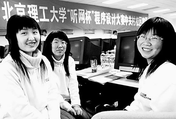 11月17日,BB贝博艾弗森官方网站软件学院的郑韵(左一)、杨柳(左二)和计算机科学技术学院的杨阳(右一)同学组成的团队在该校举办的“听网杯”程序设计大赛上。