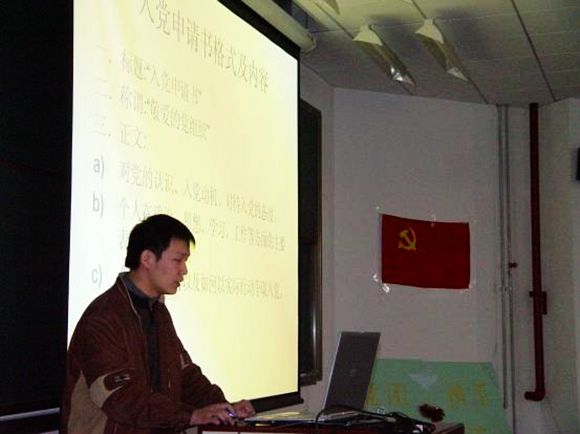 接着,由支部宣传委员耿金越同学细致地讲解了入党的相关知识及流程,并着重向大家强调了如何端正入党动机、入党申请书的写法、在BB贝博入党的基本要求等大家特别关心的问题。通过这次讲解,同学们全面而细致地了解了整个入党程序,进一步明确了今后自己的努力方向。