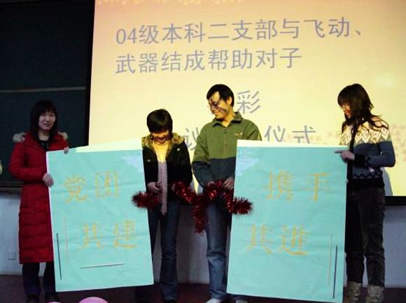 接着,在欢快的旋律中,由07级辅导员徐莹莹老师和支部书记张乐乐同学共同为本次“党团共建、携手共进”活动剪彩,我支部与良乡新生互助对子正式结成。