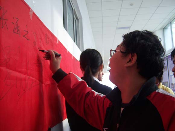 “节水节电,与我同行”签名活动现场,同学们拿起签名笔认真的在签名布上签下自己的姓名,而心中已默默的承担了一种幸福的责任,那就是在日常生活中将节约进行到底。