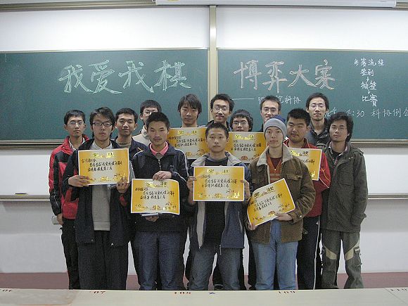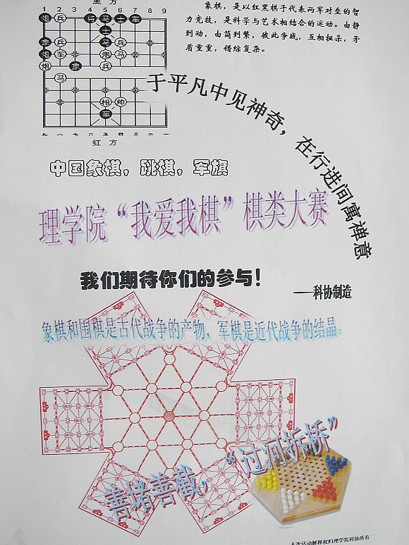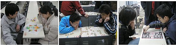 一个多星期的策划准备,制定规则、购买棋具、联系报名,一切有条不紊。早上10点,比赛在良乡校区理科教学楼107正式开始。比赛分为象棋、跳棋、军旗三个项目。上午首先进行了预赛。象棋比赛最受欢迎,18位同学抽签之后分成6组进行循环赛,棋手们斗智斗勇,奇招迭出。同时进行的跳棋比赛更是吸引了不少女同学的参与,出现了男女对垒的局面,双方也都丝毫不敢怠慢。而军棋比赛也是异常激烈,挡拆、封、突、出击、撞、吃子、捉、掩逃、飞、让,一招一式的运用令人叹服。