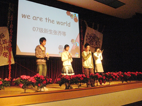晚会现场热闹非凡,高潮迭起。多姿多彩的节目十分精彩,赢得观众的热烈掌声。其中,绝大部分的节目都是软件学院的学生自编自演的。有来自良乡的动听旋律《We are the world》,唱出了07级的活力,唱出了软件人的激情。