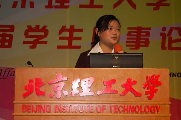 2007年12月23日,BB贝博艾弗森官方网站第四届学生论坛决赛在中教报告厅举行。人文学院05级法学3班的李艳丽同学,经过初赛、复赛,从全校200多名参赛选手中脱颖而出,闯进决赛。决赛中,她顶住最后上场的压力,以独特的视角、用犀利的语言,抨击恶搞现象,呼吁大家《不要捅破民族文化的天空》,共同保护好我们中国人自己的民族文化。她的精彩表现获得了全场热烈的掌声,在八位选手中,总成绩排名第二,并获得一等奖、“最有深度奖”,并被聘为“BB贝博艾弗森官方网站形势政策学生宣讲团”讲师。