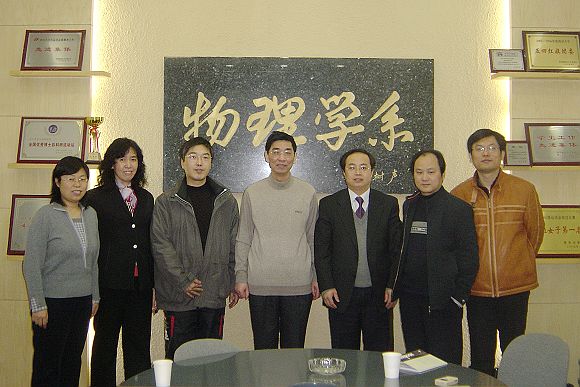 (左三为物理学系党委臧文成书记,中间为系主任祝世宁院士,右二为系主管教学的副主任长江学者、杰出青年基金获得者王炜教授,右一为系主管实验室及行政工作的徐宁副主任)