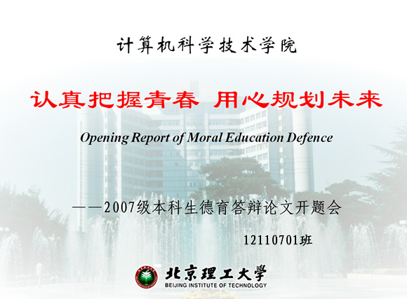 此次12110701班德育答辩开题会拉开了计算机科学技术学院2007级的德育答辩开题会的序幕,其他每个班级都会举行这样的别具意义的开题会。在2007级本科生中举行的德育答辩开题报告会是仅仅是大学四年德育答辩的一个开始,我们希望所有同学都“认真把握青春,用心规划未来”,用自己的实际行动来谱写自己大学生活的一份满意答卷。