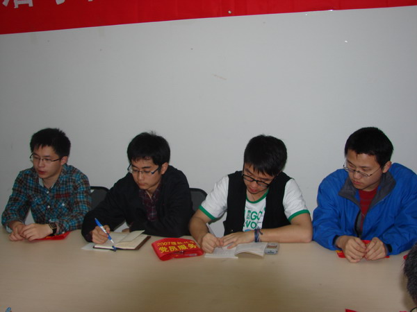 会议伊始,刘老师首先对开学以来本年级党支部活动开展情况作了简单的总结。本学期以来,软件学院本科生2007级党支部在学院分党委的指导下,积极配合学院共产主义学习实践会的理论学习和实践活动,在07级组织开展学院党课,并积极深入学习十七大和两会精神,负责在年级中开展了“我以我手书两会”等活动,有力地促进了年级党建工作。但是,由于支部成立时间不久,支部成员经验不丰富,组织机构和制度化建设依然需要进一步完善;而学院和年级的实际情况也要求党支部工作必须要进一步深入群众,深入年级,为学院学风建设和其他重点工作服务,树立学生党员的威望,体现学生党员的模范带头作用和党支部工作的先进性。