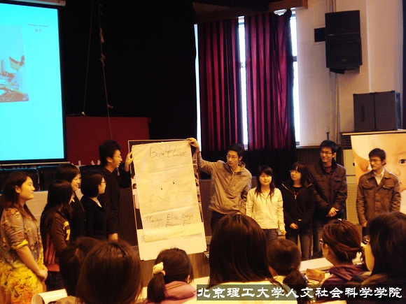 接下来进行的是由陈晗女士为我们组织的破冰游戏。在这个环节中,事先被随机分成了八组的同学们,按要求要在十五分钟内,与自己同组的同学共同协作讨论,选出一位组长,确定自己组的组名、组歌以及口号。紧迫的时间使之前还不甚熟悉的同学们都不再拘束,与大家一起分享自己的看法。随后,所有的小组轮流上台,与大家分享他们的讨论结果。同学们在游戏中找寻到了小组中的集体意识,为之后即将进行的分组讨论做好了铺垫。