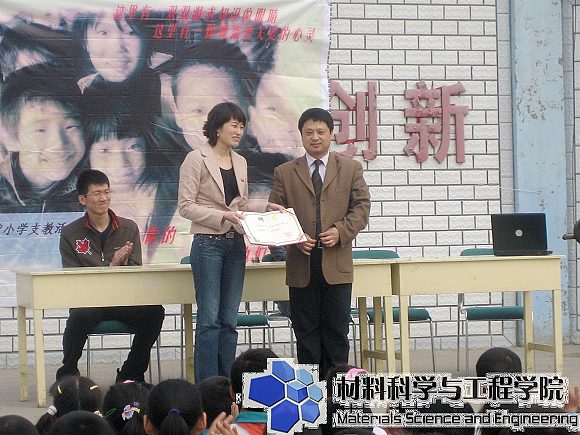 材料学院副书记副院长韩笑为西营小学六位品学兼优的"学习之星"颁发了奖状和奖品,鼓励他们再接再厉。