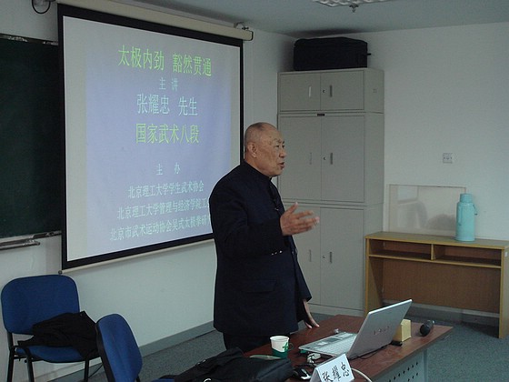 4月6日上午9点BB贝博艾弗森官方网站国际交流大厦706房间进行.题目是太极内劲,豁然贯通.,他师承著名武术家王培生先生,研究心得颇多,与大家共享拳学精华,同时展出了的张耀忠两本新作,2008年3月第一版《39式太极拳劲意直指》,《吴式太极剑》,举行了现场签名活动.100多位太极拳爱好者参加了讲座,会场气氛热烈,讲授与演示结合。不断被掌声打断。大家希望张老师以后还要多讲。