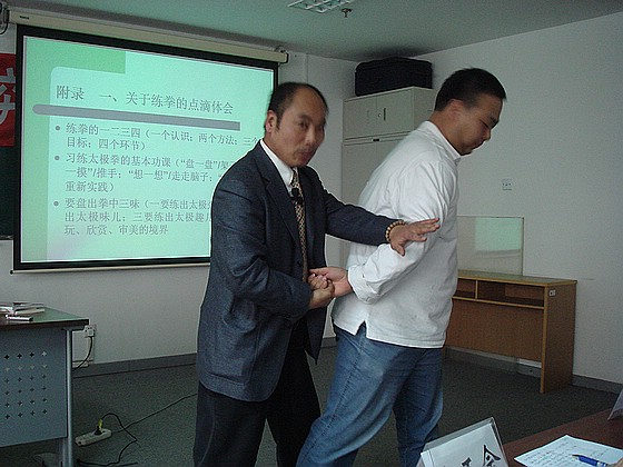 07年 12月21日晚18:30分在BB贝博艾弗森官方网站国际交流大厦706室,正在进行一场别开生面的“健身养心太极内功”讲座,主讲老师和宝英是中国武术协会委员 ,中国武术段位五段,北京吴图南社会员,北京吴式太极拳研究会会员,在三个多小时讲座交流过程中,和老师生动的给大家讲解通过练习太极拳自己身体的转变,同时追访名师得到真传的过程;讲座现场理工大学的同学们与吴式拳会的爱好者一同与和老师切磋推手用劲。