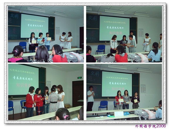 4月27日晚,外国语学院2007级“青春奥运文明行”知识竞赛在良乡校区理科教学楼105隆重举行。宇航学院徐莹莹老师,机车学院李文彪老师,理学院闫磊老师,设计学院毛昭君老师,计算机学院高强老师,外国语学院张磊老师作为嘉宾评委出席此次竞赛。外国语学院2007级共组织6个代表队参加比赛。比赛分为5轮,分别为必答题、抢答题、视频题、表演题、风险题,内容涉及奥林匹克运动历史知识、北京奥运会组织筹备情况、历届奥运会比赛、校园文明礼仪、涉外礼仪等。