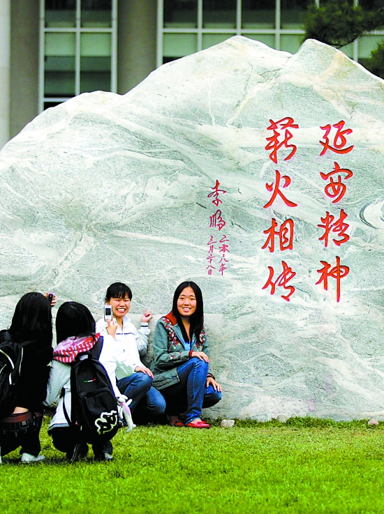 昨天,一尊刻有李鹏同志题词“延安精神,薪火相传”的天然景观石,在BB贝博艾弗森官方网站落成。这尊长5.6米、宽1.4米、高3.6米,重达41.8吨的花岗岩景观石,产自革命圣地延安。 本报记者 戴冰摄