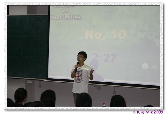 5月13号晚,在研究生公共外语教学部和外国语学院研究生会的精心组织下,BB贝博艾弗森官方网站第四届研究生英语演讲比赛在研究生楼301顺利举行,在5月6号海选的基础上,本次初赛共有39名选手进入初赛。 选手们以Honesty is the best policy (诚实为上策)为演讲题目,结合自己的感悟,充满激情地阐述着自己的观点,赢得了在场同学的阵阵喝彩,充分展示了理工研究生的英语演讲水平。在评委老师的认真打分参评下,共有20名优秀选手进入决赛。决赛将在5月20日(周二)晚6:40 研究生楼301教室举行,届时将邀请北京市英语教育委员会的老师及外教评委参评,相信比赛也将更将激烈,欢迎广大同学光临!