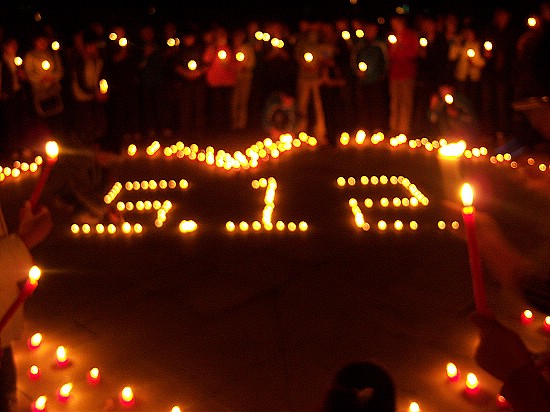 现场每位同学手持一支蜡烛,没有灯光,没有喧嚣,有的只是北理学子对灾区人民发自内心的哀悼与祝福。同学们用手中的蜡烛点燃了地上摆放着的红色心形蜡烛和“5.12”字样白色蜡烛,安静的烛光映红了同学们尚未成熟却带有一丝忧伤的脸庞。大家一起唱起了《让世界充满爱》后,一切都沉静下来,只剩下烛火被风吹动的哧哧声,这时,所有同学都在静静地为死去的亡灵默哀三分钟。现场的每一位同学都十分感动,都为灾区而默默地祝福。