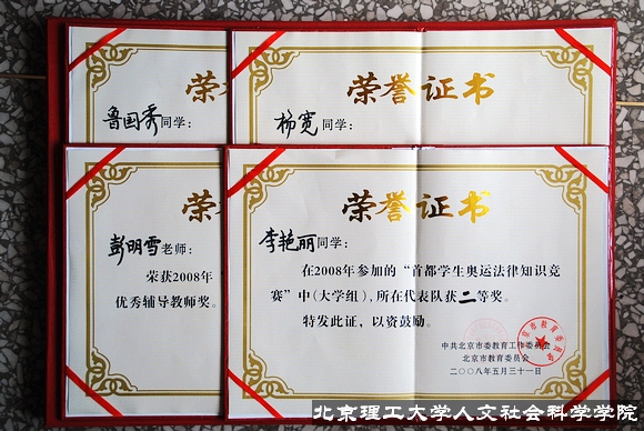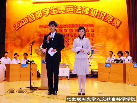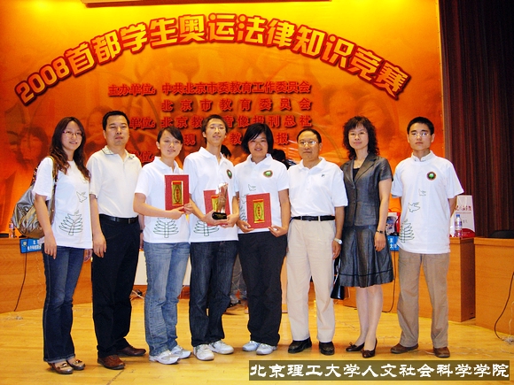 2008年5月31日下午两点,2008首都学生奥运法律知识竞赛大学组决赛在史家小学礼堂隆重举行,BB贝博党委宣传部部长贺亚兰、人文学院党委书记张剑军、人文学院副书记副院长贾利军亲临比赛现场加油助威。人文学院05级法学专业杨宽、李艳丽、鲁国秀三名同学代表BB贝博出赛,同北京航空航天大学、北京第二外国语学校等五所高校代表队一起,开始了激烈角逐。代表队最终不负重望,获得二等奖的好成绩。奥运法律知识竞赛在由人文学院2006级40名同学组成的啦啦队喊出的响亮口号——“法治中国,和谐奥运,激情北理,青春飞扬”中开拉了序幕。经过一个月的紧张备战,杨宽、李艳丽、鲁国秀三名同学在赛场上信心十足,在必答题、抢答题、风险题三个环节中沉着冷静、团结合作,从容应对多变的赛场形势,他们的精彩表现赢得了全场观众的热烈掌声,并终以优异成绩获得二等奖。
