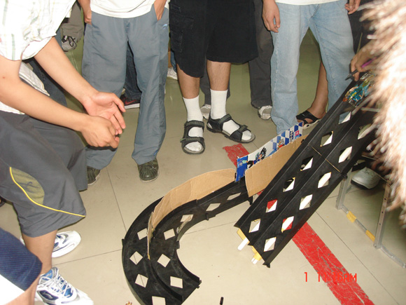 接下来我们又进行了精彩激烈的爬坡赛。比赛初期的一定坡度下,几乎所有四驱车都可以顺利通过。但当坡度升到一定程度时,有的四驱车开始被淘汰。这就考验了同学们如何在马达、轮胎、前后轮驱动等方面的协调搭配问题。