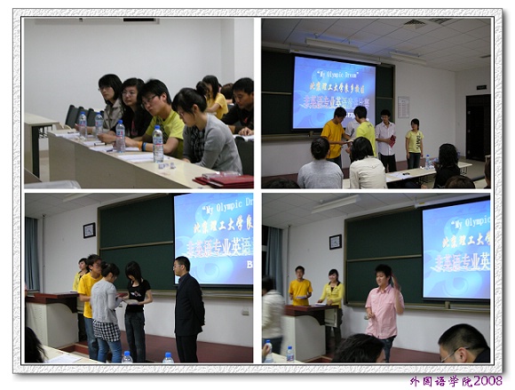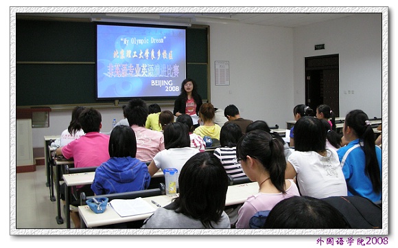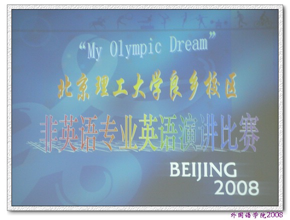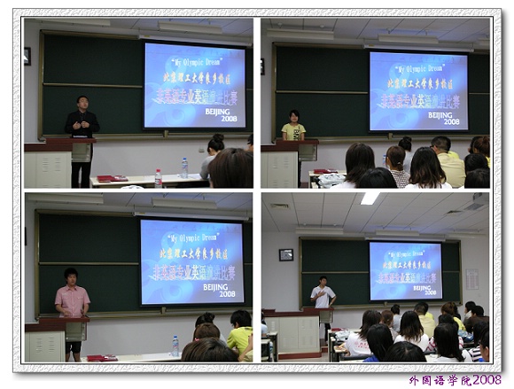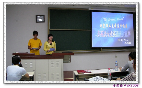 2008年6月3日,由BB贝博艾弗森官方网站外国语学院和校团委联合举办的“My Olympic Dream”BB贝博艾弗森官方网站良乡校区2007级非英语专业英语演讲比赛决赛在理科教学楼306进行。外国语学验英语专业研究生谢森、吴越以及“外研社杯”全国大学生英语辩论赛亚军得主许慎、王莉娜担任本场比赛的评委。外国语学院2007级英语专业学生胡绍聪、李立柏担任比赛主持人。在初赛中一路过关斩将最终晋级的来自不同学院的六名选手参加了本次比赛。