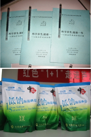 党支部针对活动主题精心制作了展板,张贴在村委会的宣传橱窗中,并将报告内容印制成简明手册发给村民。同时,为了宣传中国营养学会提出的每人每日食盐不超过6g的健康膳食,给村民们免费发放了低钠盐,并详细介绍了低钠膳食在预防心血管疾病中的优势。