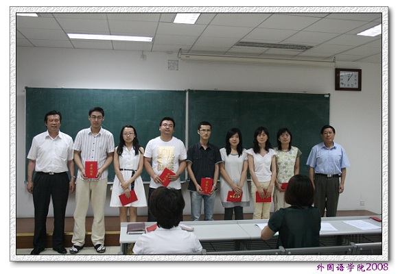 在随后进行的表彰中,吴树敬院长宣布了2007-2008年度核心期刊论文发表,SCI/SSCI检索论文,国家、部委、校级立项等作出突出成绩的教师名单。宣布了青年教师基本功比赛中获奖教师名单。外国语学院党委书记王文清教授、院长吴树敬教授为获奖教师颁奖。