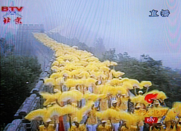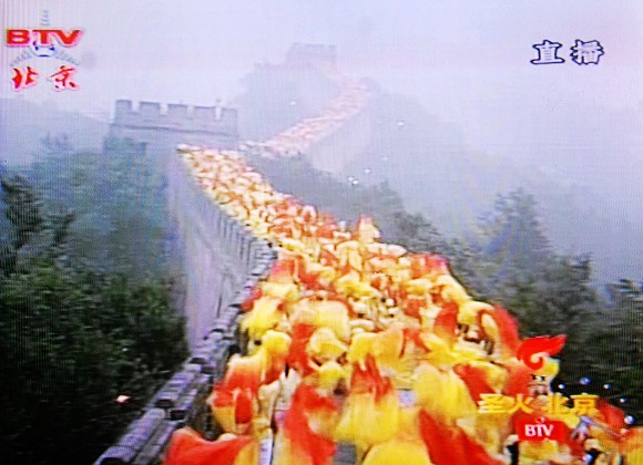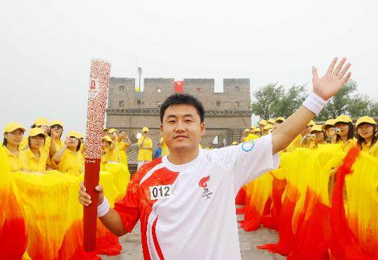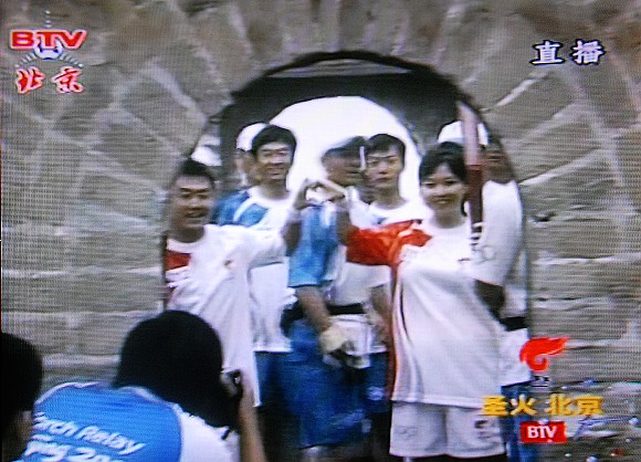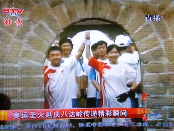 长城上的火炬传递由18名火炬手共同完成。经北一烽火台,一直传递到北四烽火台顶端。2008名青年学生身着黄色上衣、白色裤子和黄色帽子用红旗、扇子在长城上以行为艺术的手法组成龙的形象,与奥运圣火交相辉映,颇为壮观。