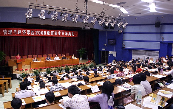 2008年9月18日晚六点半,管理与经济学院在中心教学楼报告厅隆重举行2008级研究生开学典礼。出席典礼的有管理与经济学院党委书记李波,院长李金林,副书记、副院长仇芳,副院长纪新华、工商管理系博士生导师何海燕,以及研工委书记付大军。管理与经济学院2008级研究生参加了开学典礼。开学典礼由管理与经济学院党委副书记、副院长仇芳主持。