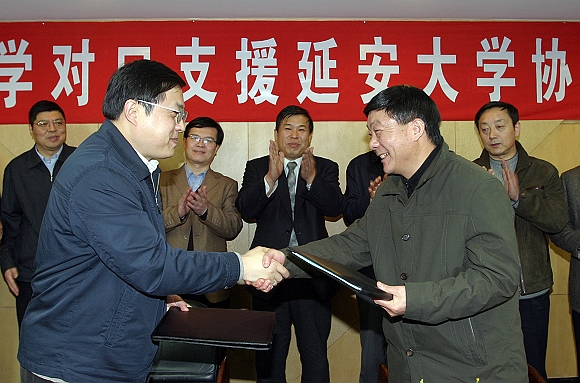 签字仪式上,BB贝博赵显利副校长,延安大学王延奇副校长分别介绍了两校的基本情况,两校分别是中国共产党创办的第一所理工科大学和综合性大学,都有着悠久的历史和光荣的革命传统,两校之间的联系源远流长,因此有着良好的合作基础。李和章副校长宣读了协议的主要内容,主要包括:BB贝博加大对延安大学学科建设的扶持力度,帮助制定和完善学科建设规划。重点帮助建设化学工程与工艺等6至8个专业,以增强延安大学适应和服务陕北老区经济建设的能力;帮助建设20门左右重点课程,并在此基础上建设10门精品课程,争取1至2门入选国家级精品课程;每年选派10至20名院士或专家到延安大学进行学术讲座,开展学术交流;每年接收延安大学5名免试推荐研究生攻读硕士学位,代培2至3名博士研究生;帮助实现优势学科专业博士学位授权点的突破,联合招收化学工程与工艺博士研究生;指导帮助延安大学制定实验室建设发展规划,重点建设过程装备与控制等4个实验室,并争取其中1至2个建成省级重点实验室,同时在条件允许的情况下,援助部分教学仪器设备;帮助延安大学开展师资队伍建设,每年接受延安大学选派15-25名优秀青年教师来校进修深造;选拔延安大学教师到校参与研究生培养工作,提高教学科研水平;在延安大学开设研究生课程进修班,提高教师整体素质;BB贝博与延安大学,结合当地实际情况,联合申报科研项目,并帮助延安大学加大科研项目申报立项的力度。在公共服务体系建设方面,BB贝博艾弗森官方网站提供图书资料和图书馆信息共享,并帮助做好校园信息化建设工作,同时将协助延安大学开展对外合作交流,帮助建立长期研究的联合实验室,召开国际学术会议等。