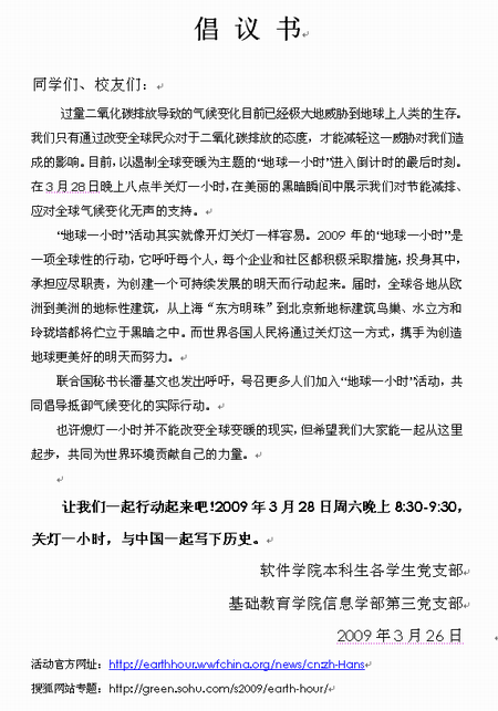 3月26日中午11:30,在一号食堂和二号食堂的门口,基础教育学院信息学部的第三党支部为同学发了关于“地球一小时”的活动倡议书。此次活动是联合软件学院本科生各学生党支部共同举行的活动,旨在通过宣传保护地球环境、实现可持续发展,从而落实科学发展观的学习和实践,树立学生党员的先锋模范带头作用。