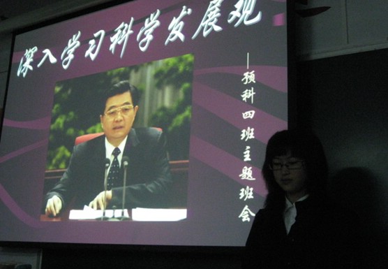 四班团支部书记张静以PPT的形式和大家一起学习了党的三代中央领导集体关于科学发展观的重要论述,认真领会全面协调可持续的科学发展观的重大意义。看完后,学生代表进行专题发言,畅谈自己对科学发展观的认识,特别是如何将科学发展观与自身的人生规划相结合的思考,提出了不少精彩的观点和想法。