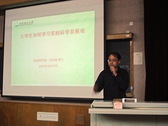 2009年4月14日晚七时,我们管理与经济学院的全体同学在7号楼108教室聆听了一堂题为“大学生如何学习和实践科学发展观”的形势政策课,主讲人是军工文化教育研究中心秘书长、BB贝博艾弗森官方网站党委组织部副部长刘存福老师。