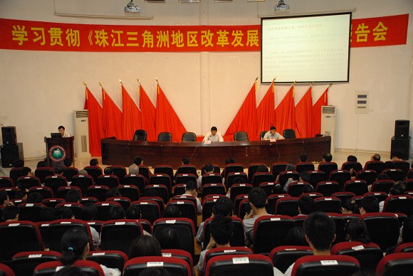 4月16日下午,珠海市委常委、宣传部长黄晓东莅临BB贝博珠海学院,就《珠江三角洲地区改革发展规划纲要(2008-2020年)》作专题报告,珠海学院院长兼党委书记刘淑艳等学院领导和300多名师生党员与会聆听。报告会由珠海学院党委副书记、纪委书记兼副院长王文清主持。