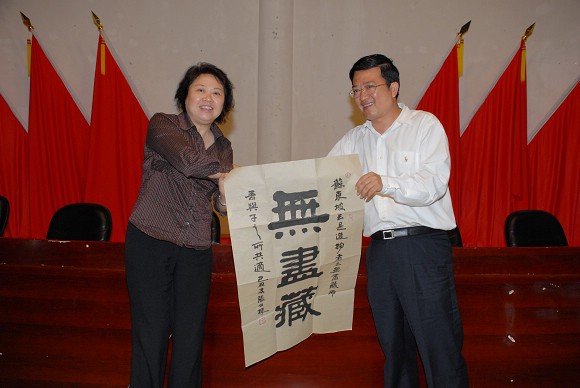 报告结束后,珠海学院院长兼党委书记刘淑艳代表珠海学院向市委常委、宣传部长黄晓东赠送中国书法家协会会员的书法作品。