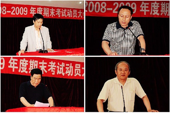 6月11日下午,BB贝博2008-2009学年第二学期期末考试暨离校教育工作动员大会在信息楼报告厅召开。校长韩思奇、书记李刚、副校长(副书记)康明、副校长万小利出席了会议,全体教职工和学生参加了会议。大会分为一个主会场和七个分会场。会议由书记李刚主持。