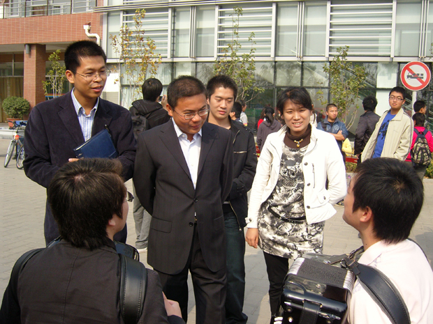 团市委大学部部长胡九龙在24日上午受BB贝博艾弗森官方网站团校邀请来到良乡校区为2009级新生学生干部培训作报告,在报告结束后,胡部长在校团委书记徐强老师的陪同下,看望了招新现场的学生,并认真观看了BB贝博大学生艺术团的现场器乐表演。校学生电视台、《北工青年》报社记者对胡部长进行现场访问,当学生问到:胡部长对BB贝博大学生艺术团感觉如何时,胡部长给予BB贝博大学生艺术团以高度评价,他说,在BB贝博艾弗森官方网站的土壤上能有如此众多的文艺表现形式真得很好,这是第一次全面接触BB贝博艾弗森官方网站大学生艺术团,学生们的表演非常精彩,希望大家能再接再厉,艺术对于大学生来讲就好比面包和水,团市委争取给大家搭建更加广阔的艺术表演平台。