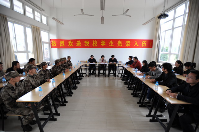 院长、党委书记刘淑艳教授讲话,她代表学校和个人对即将入伍的同学表示热烈的祝贺,对退伍复学的老兵表示热烈的欢迎,并提出了殷切的希望。刘院长强调部队也是一所大学校,希望即将入伍的同学们珍惜在部队的机会,继续发扬学在北理的精神,坚持学习,充分锻炼和提高自己,为国出力,为校争光。