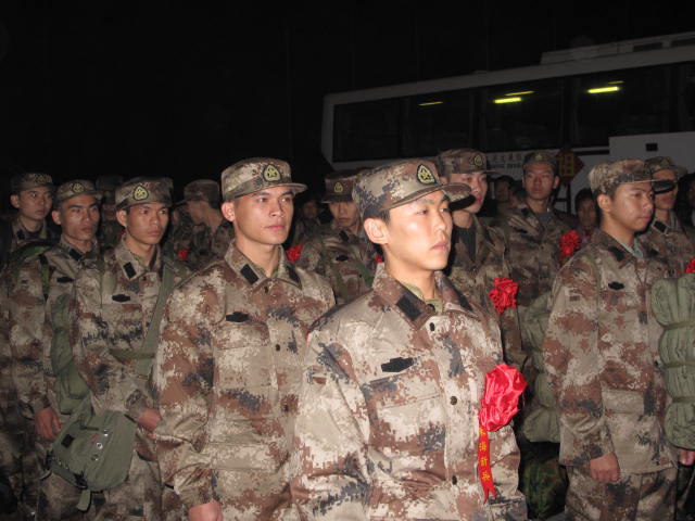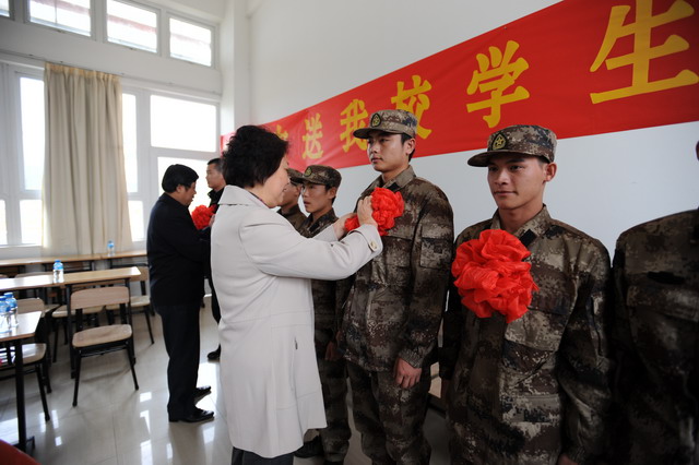最后,学校领导为新兵佩戴大红花并合影留念。10名新兵将分四批踏上入伍征途,前往成都军区13集团军、北京军区空军、武警广东总队和武警福建总队服役。