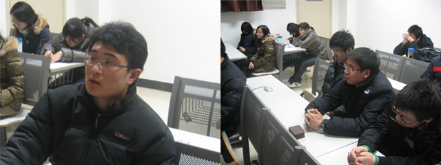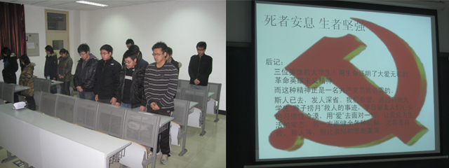 第二部分是各小组展示一段时间以来的学习心得成果。同学们各抒己见,见解深刻。金晶同学说:“英雄之举,往往是在瞬间作出的选择,不可能是经过反复的理性思考而成。但这种看起来偶发的选择,实际上渗透着他对生命、对社会责任感的理解。”李勇同学指出:“三位英雄的行为证明,90后不是垮掉的一代,一定会努力承担起社会赋予的责任。”史建伟同学说:“距事件发生至今将近一个月了。今天,我们的见解或许不会有多么高深。我们的讨论也不在于得到一个极其正确的处理问题的方法,我们的目的更不在于使每个人都要做到舍生奉献。我们只是用这个机会让大家表露自己的心声。英雄远去,留给我们的不止是感动,更多的是启迪,是思考。事实也证明我们的目的达到了。在这次总结会上能够站起来发言的同学有些还因为怯场而不能用流利的语言表达自己的心声。但是,从他们的表情,从他们那不太流利的话语中,我们能够体会到他们想说的:关爱他人,珍爱生活,珍爱自己,珍惜生命。” 吴乐同学说道:“三位英雄的大学生用生命证明了大爱无私的革命英雄主义精神。而这种精神正是一名共产党员所必需的。 斯人已去,发人深省。我们希望,通过荆州大学生救人的事迹,早日驱走人们心头的习惯性冷漠,用“爱”去面对一切,让爱成为生活的常态;另一方面健全各种机制,别让类似的悲剧重演。 ”