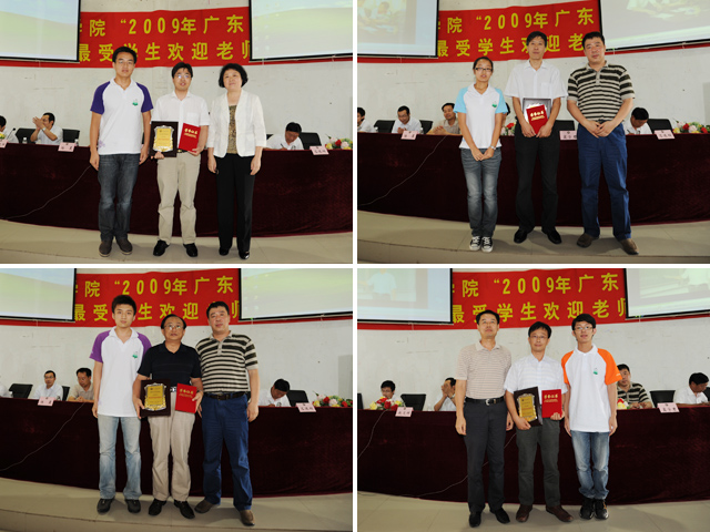 悠扬的背景音乐响起,大屏幕的画面里图文并茂地映出每位获奖教师孜孜以求、诲人不倦、辛勤工作的场景,学生代表满怀深情地简短介绍了每一位获奖教师的优秀成绩,宣读珠海学院2009年“最受学生欢迎教师”评选活动获奖教师名单,分别是文法学院戴志国老师和傅思泉老师、基础部孙洪波老师、管理学院郑俊生老师、基础部张文国老师、计算机学院李书涛老师和毕秀丽老师、外语学院胡琳娜老师、化工学院祁景玉老师、管理学院盛小丰老师。获奖教师依次走上台前,与颁奖领导和学生握手致谢,学院领导和学生代表分别为每位获奖教师颁发获奖证书和奖牌,并合影留念。