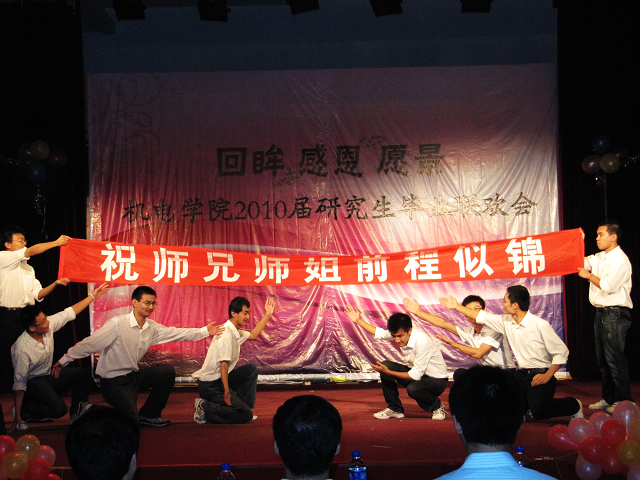 此次2010届研究生毕业生联欢会,表达了机电学院对2010届毕业生的无尽关爱之情。同时,也为即将走出校门的毕业研究生送上了最真挚的祝福,希望机电毕业研究生们在对告别校园的同时,开创出更加辉煌的未来,为伟大祖国的繁荣富强贡献自己的力量。最后,衷心祝愿2010届全体毕业研究生:前程似锦,一路顺风。