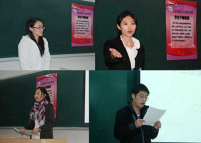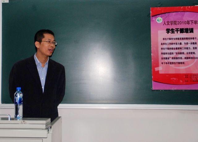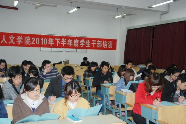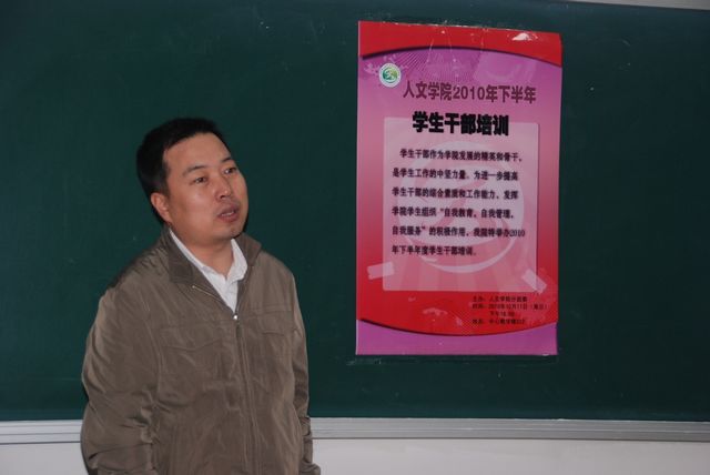 10月17日至19日,BB贝博艾弗森官方网站人文学院2010年下半年全体学生干部培训在中心教学楼322教室举行。本次培训活动本着提高学生干部的综合素质和工作能力,发挥学院学生组织“自我教育,自我管理,自我服务”的积极作用的目的,进行了为期三天的学生干部培训培训,本次共分三场举行,邀请校团委书记徐强,人文学院副书记、副院长徐贵宝,人文学院副院长贾利军及人文学院分团委书记贾效明作报告,来自人文学院各个学生组织的近80名学生干部参加。